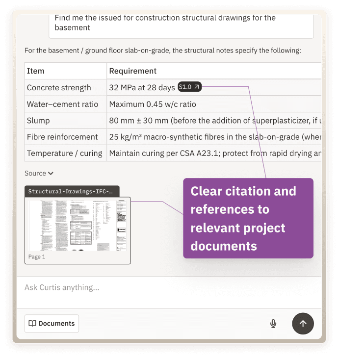 Stop digging through endless folders and files. Just ask Curtis in plain language. Curtis reads across all of your documents — drawings, specs, RFI, schedules, submittals and more — and delivers precise answers across many files.